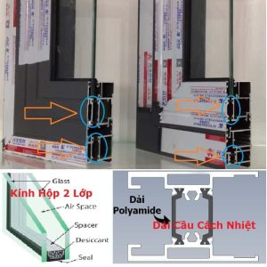Cầu nhôm cách nhiệt Có cấu tạo 3 lớp: gồm 2 thanh nhôm định hình được nối với nhau bằng cầu cách nhiệt làm bằng vật liệu polyamit. Chính dải cách nhiệt polyamide này có vai trò quyết định đối với khả năng cách âm và cách nhiệt tuyệt vời của vỏ cửa.