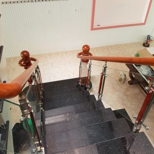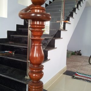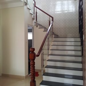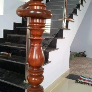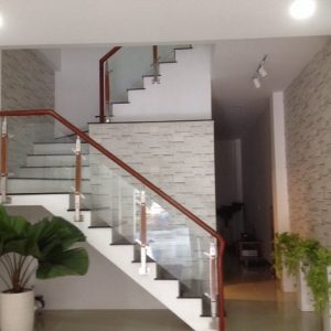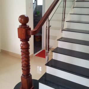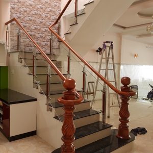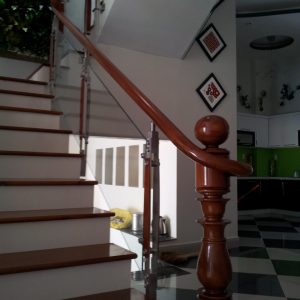 - Trụ cầu thang được sử dụng là loại trụ cao inox ốp gỗ kết hợp với trụ cái để tạo thêm sự chắc chắn và sang trọng, phù hợp với mọi loại nhà.
