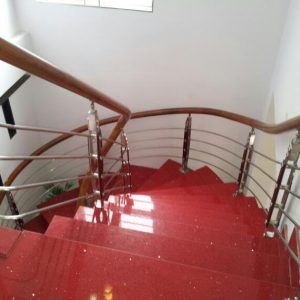 - Mẫu lan can LCCT002 được sử dụng loại tay vịn gỗ 60×80 (hình elip) hoặc tay 60×60 (bo tròn) được uốn cong lượn mềm mại theo bản thang, tạo cảm giác chắc tay và thoải mái khi sử dụng.